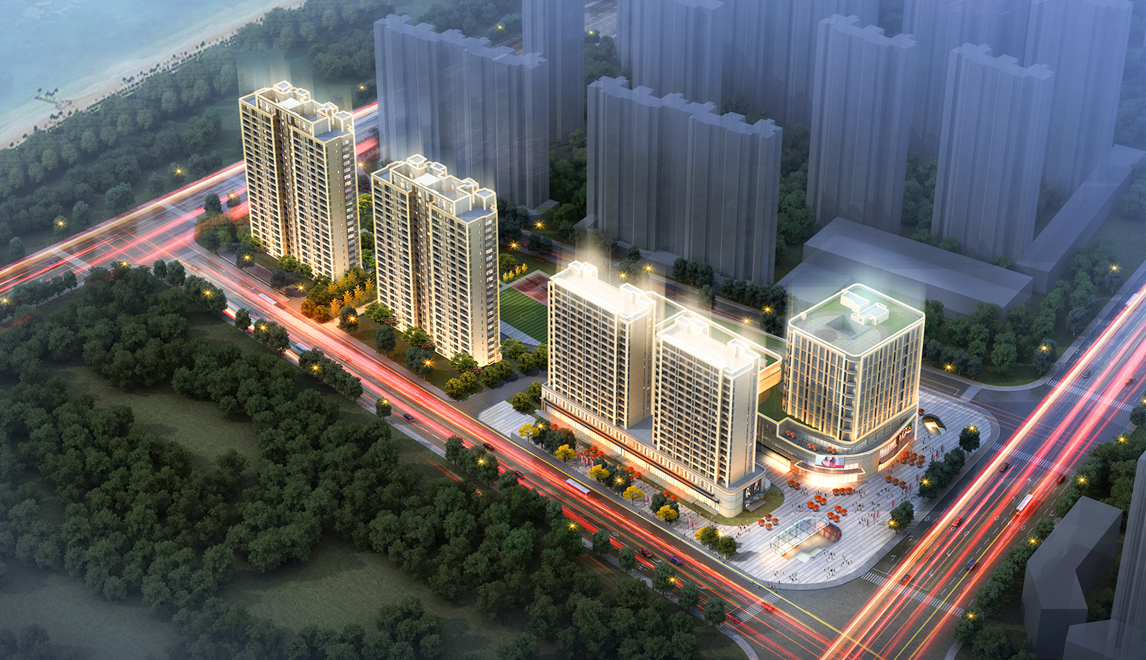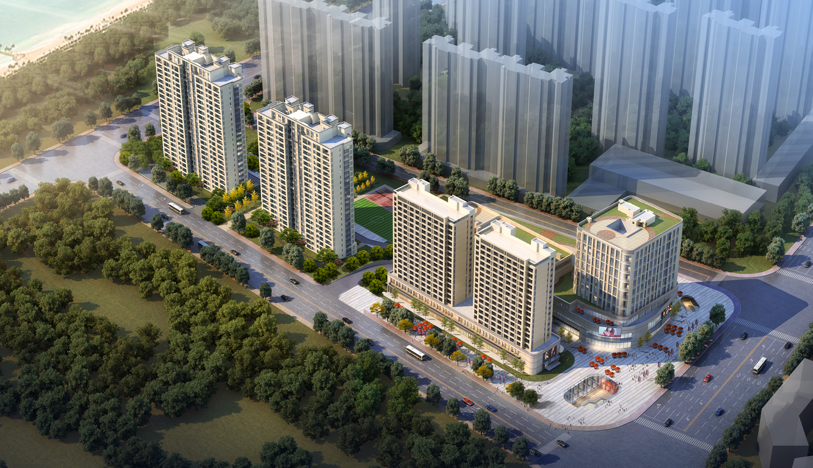 合理的功能分區(qū),沿城市主干道打造社區(qū)服務配套設施,服務小區(qū)及周邊居民,住宅建筑在融合城市肌理的情況下,最大限度遠離北側(cè)已建的住宅區(qū),減少對北側(cè)已有住宅的遮擋及影響。本項目充分利用地下公交首末站,采用了類地鐵上蓋的商業(yè)模式。