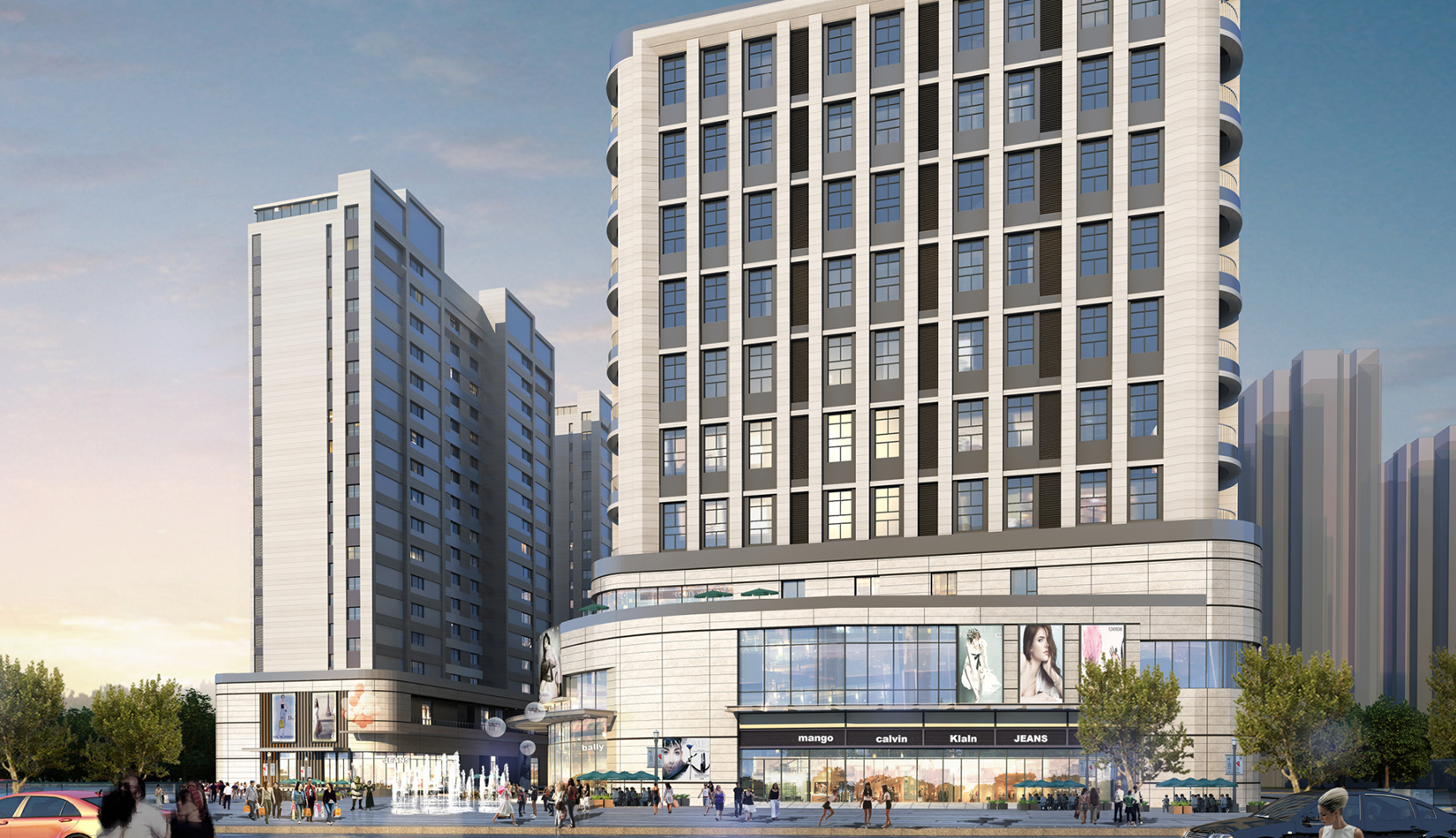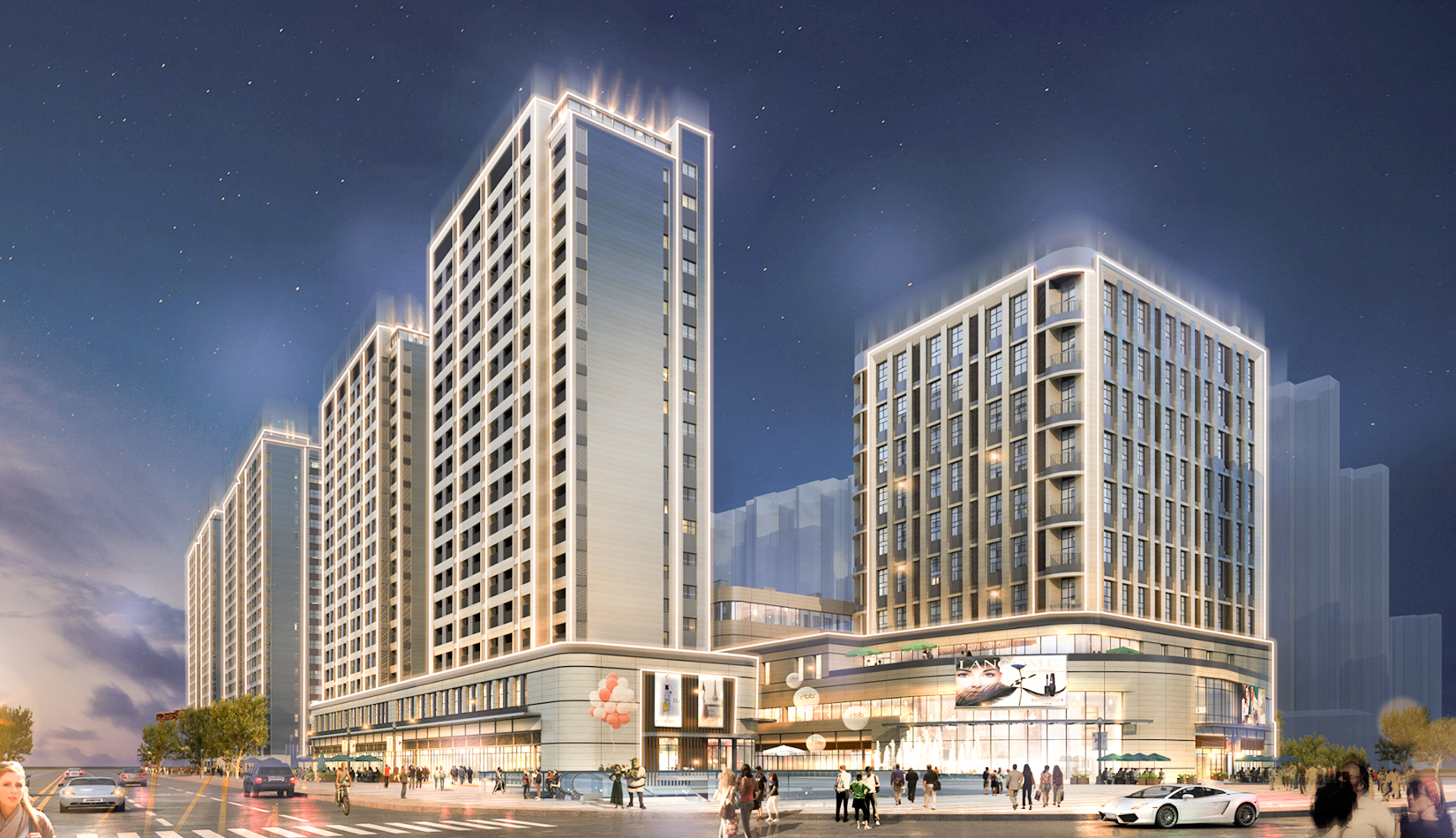 立面打造可識別性的“社區(qū)”建筑語匯,在周邊版塊中做到脫穎而出。建筑風格莊重精美,通過運用傳統(tǒng)美學法則來使現(xiàn)代的材料與結(jié)構(gòu)產(chǎn)生規(guī)整、端莊、典雅的安定感。商業(yè)立面通過將具有力量感的矩形石材墻面和玻璃幕墻進行體塊穿插與虛實結(jié)合。勾勒出與住宅風格一致的現(xiàn)代,簡約,富有商業(yè)氣息的造型。同時,創(chuàng)造出豐富的露臺空間與立面層次,完美的樹立了本項目的沿街形象。