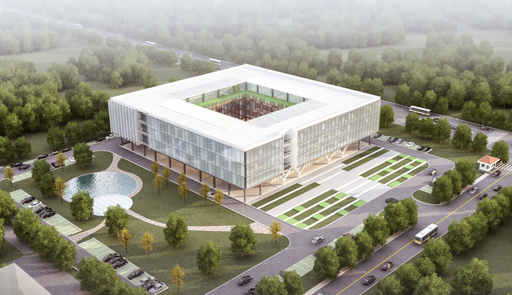 項(xiàng)目以辦公空間的合理性、實(shí)用性、靈活性作為設(shè)計(jì)點(diǎn),運(yùn)用綠廊、簡約立面等手法將企業(yè)文化與生態(tài)辦公理念相融合,同時(shí)充分考慮和拓展設(shè)計(jì)中的可能性,從而營造出怡人的辦公空間和景觀環(huán)境。
