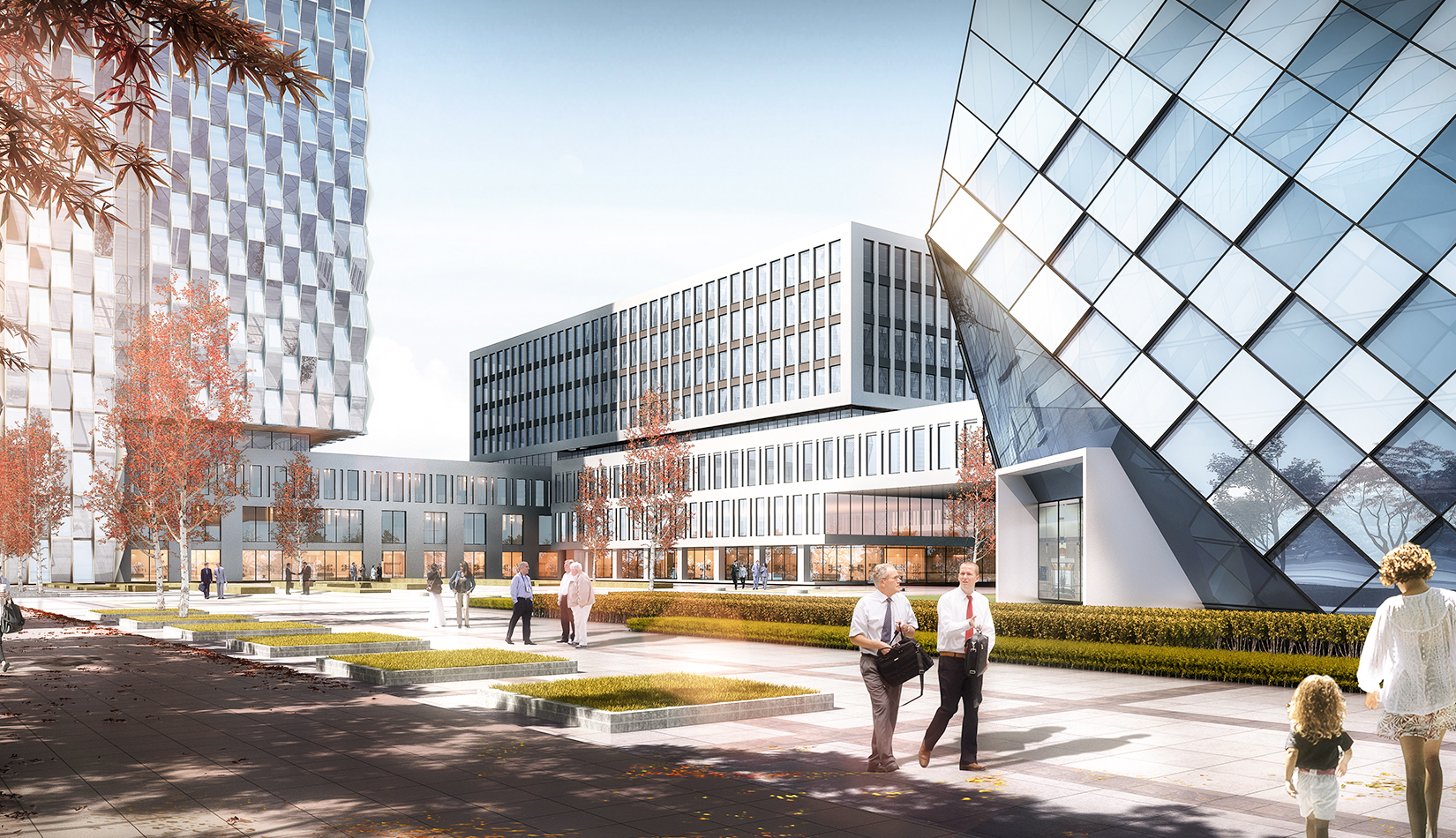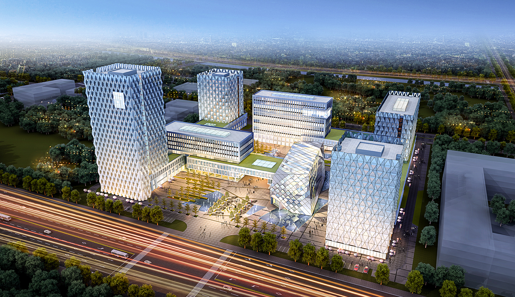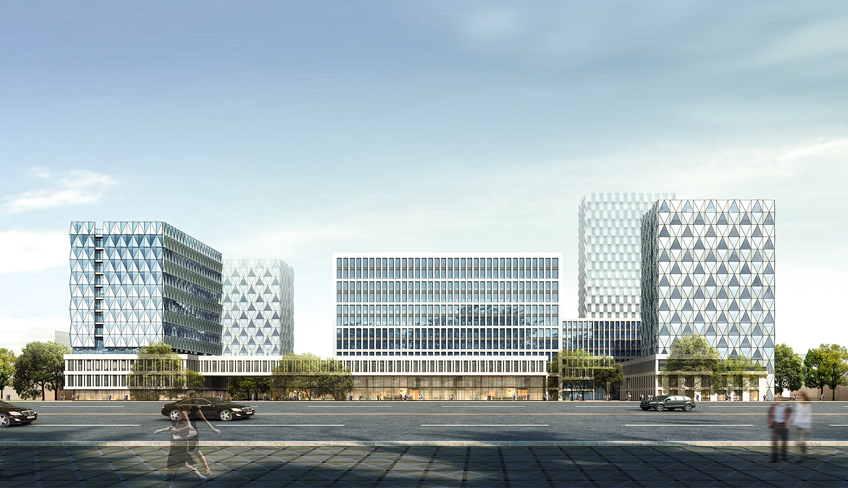 建筑立面風格現(xiàn)代簡潔,高層塔樓以玻璃與金屬幕墻為主,塑造其硬朗簡潔的建筑性格,內部兩棟建筑采用格構式立面風格,同樣以簡潔為設計原則,展現(xiàn)其富有理性秩序的立面形象。