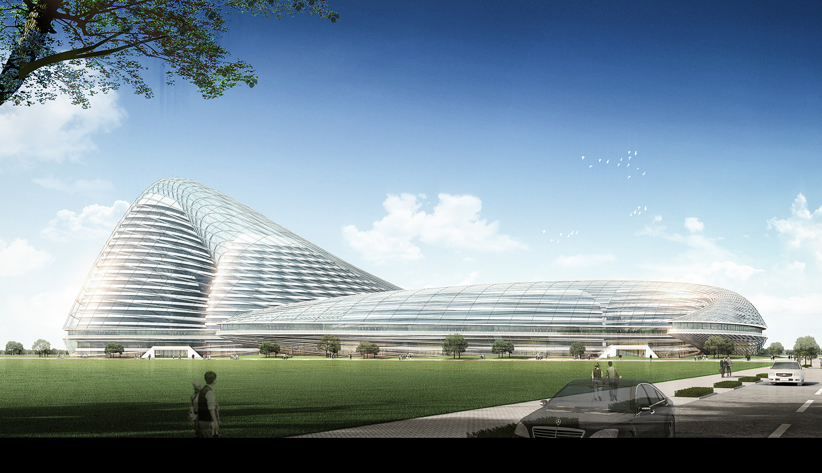 立面采用玻璃幕與智能金屬材料搭配,形成新型生態(tài)建筑。