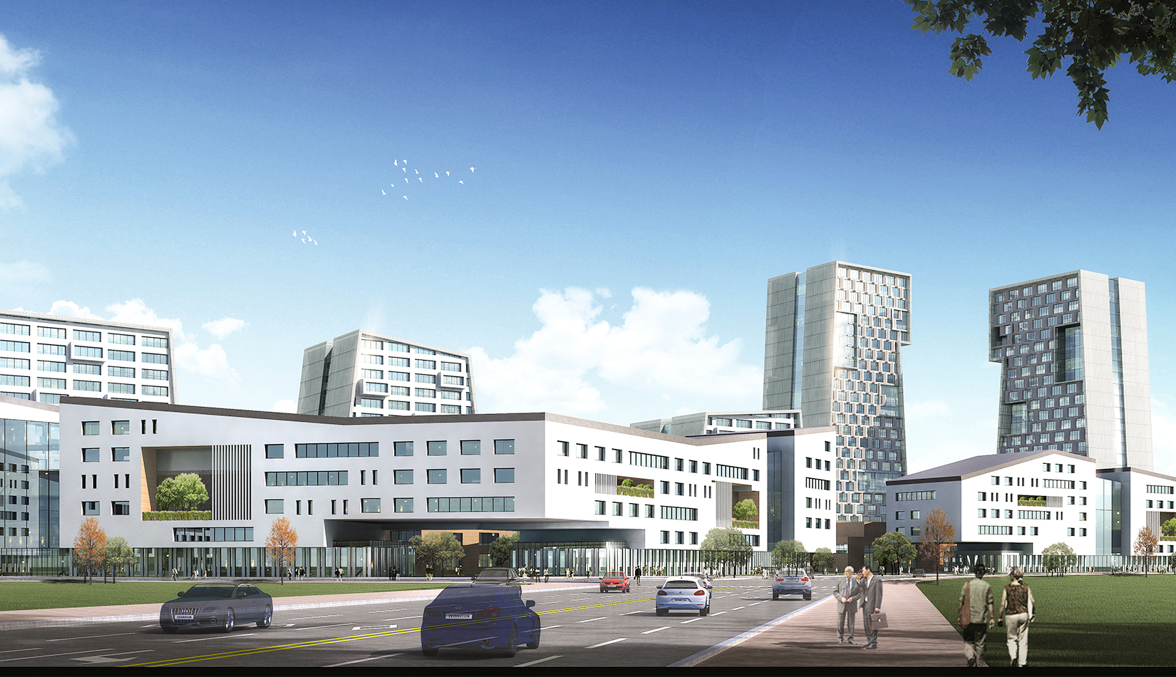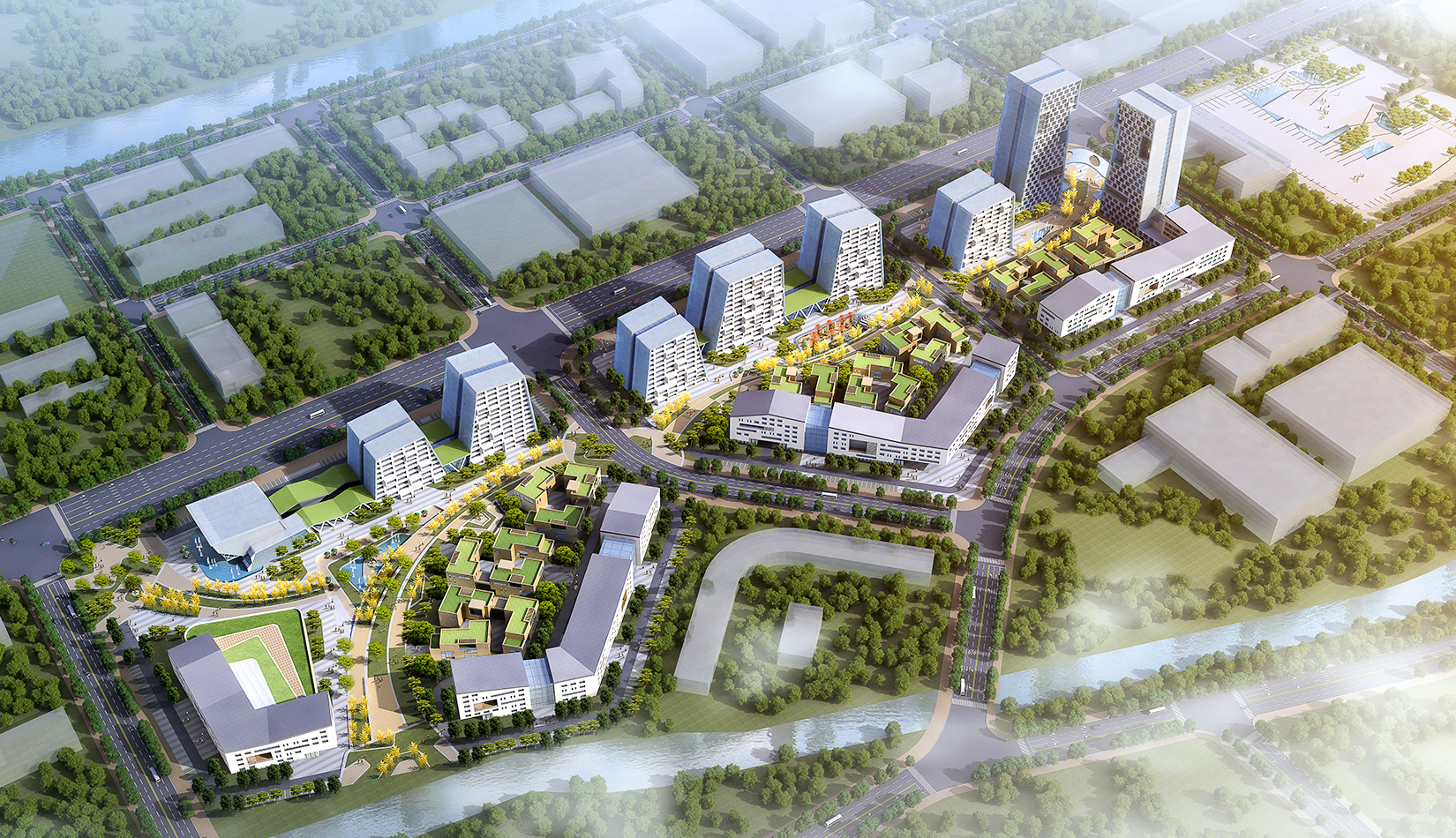 為了打造一個(gè)完美的城市沿街形象,以及營(yíng)造一個(gè)安靜舒適的工作與休閑空間,我們采用了半圍合的規(guī)劃布局,北側(cè)高層建筑基本成“一”字布局,高低錯(cuò)落,塑造完美的城市天際線,宛如一條盤旋上升的巨龍;在南側(cè)一個(gè)個(gè)長(zhǎng)方形建筑成折線型連續(xù)排列,隔離周邊嘈雜的城市環(huán)境,猶如越出水面的“金鱗”,中央景觀帶東西側(cè)以友好的姿態(tài)向城市開放,美化城市形象。\