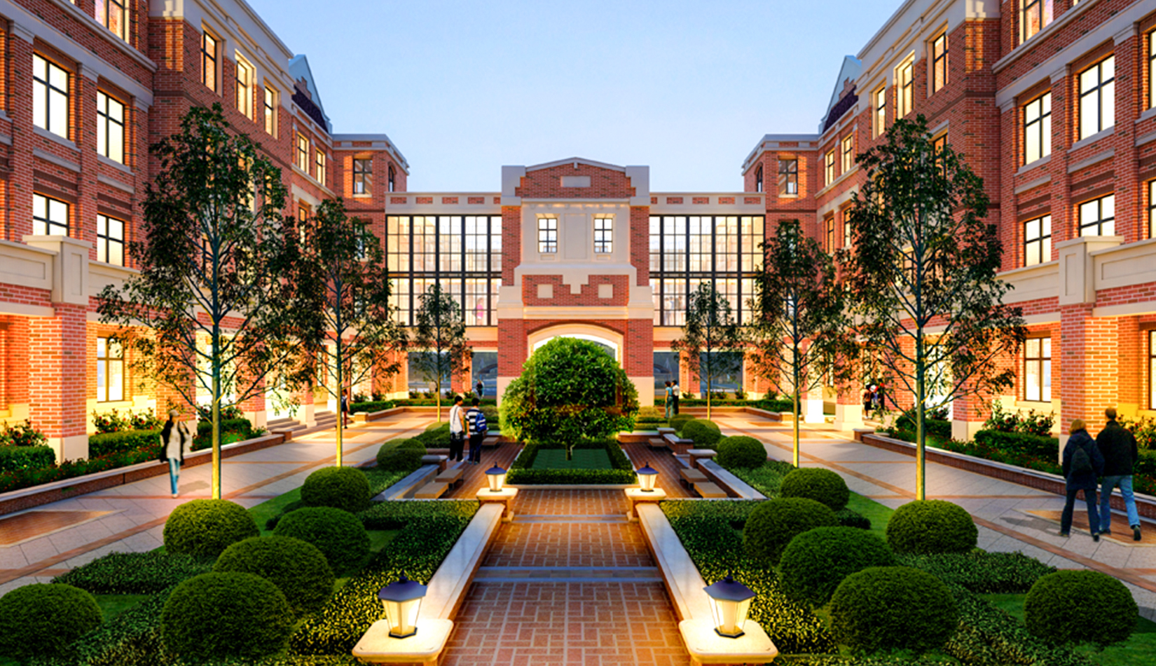 學院派的院落空間布局: 規(guī)整的建筑軸線布局,古典的建筑界面,方整的院落交流空間,結合廣場、綠地,營造百年學府的低調(diào)。