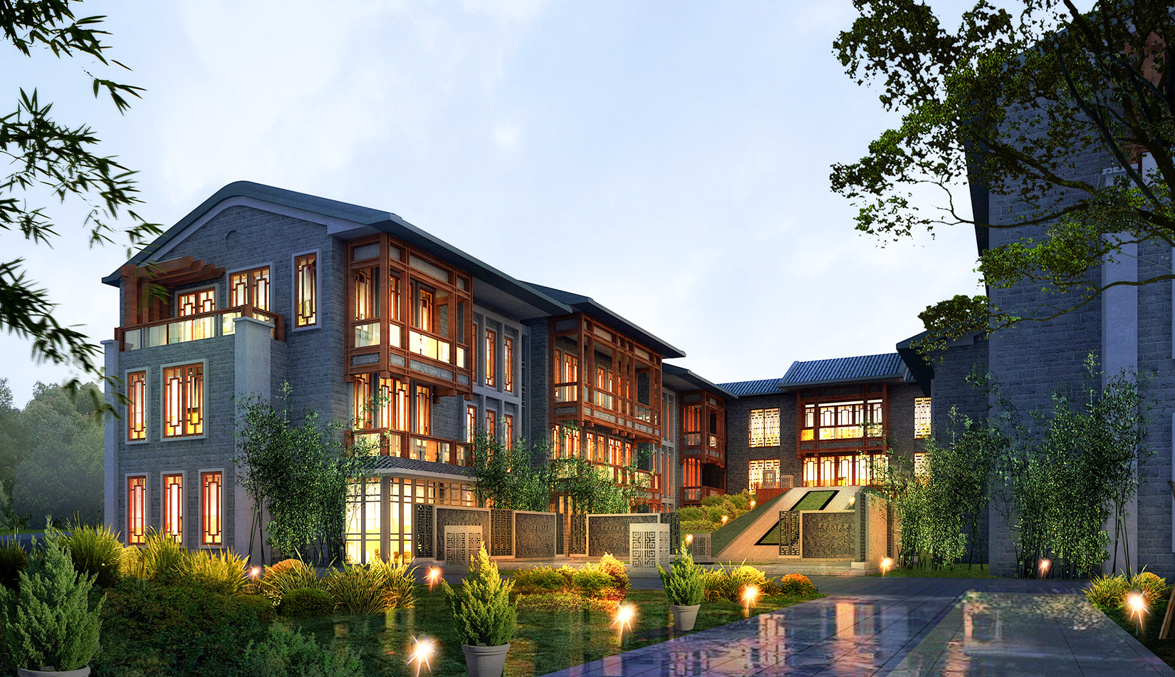 建筑造型采用中國古典建筑形式,立面符號提煉古典的建筑符號,努力營造出中國傳統(tǒng)私塾的學(xué)院派的風(fēng)格。
