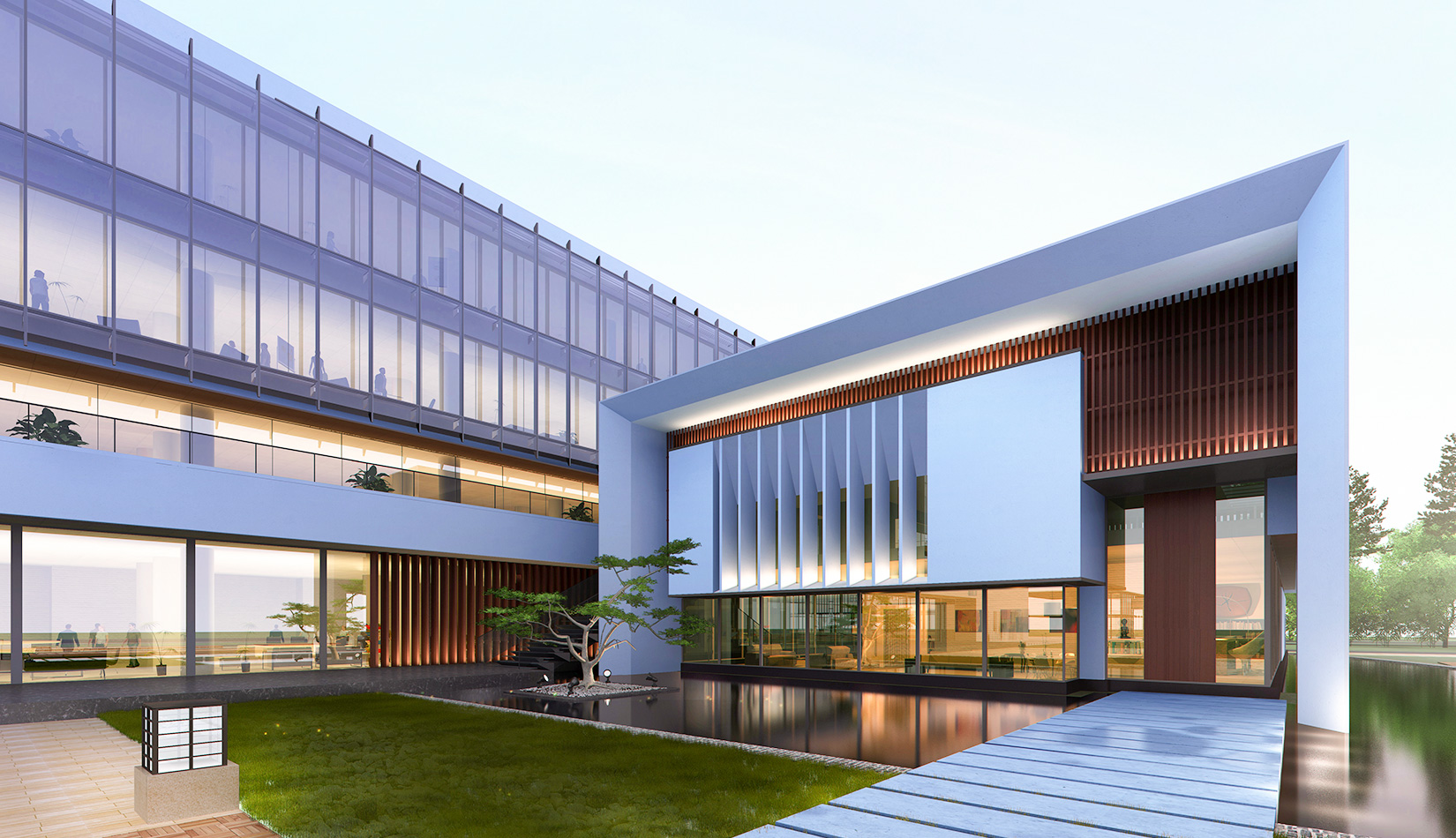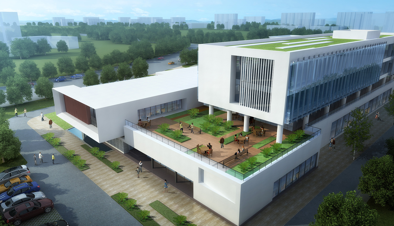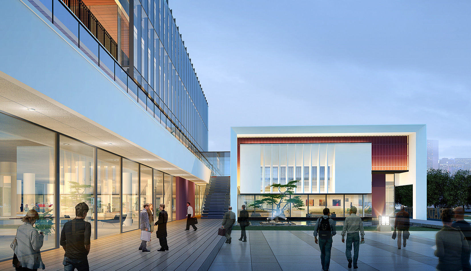 作為中韓貿易合作區(qū)一期啟動區(qū)的重點項目,其承擔著對外展示以及為后續(xù)發(fā)展提供服務平臺的功能。因此設計力求穩(wěn)重大氣,以4 層的體量打造出地標性的建筑。設計運用簡潔的外形、寧靜的色彩,外立面以白色涂料和木格柵為主,尊重自然,打造一種平和寧靜的感覺。在空間設計上通過共享空間、上人露臺和一層大平臺,創(chuàng)造出舒適宜人的工作環(huán)境;在技術上通過地源熱泵、呼吸式幕墻、雨水收集等的應用,實現建筑的綠色節(jié)能環(huán)保。