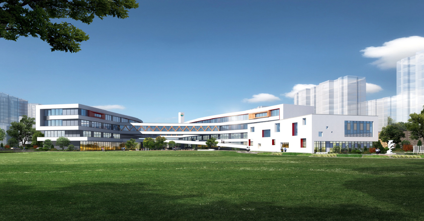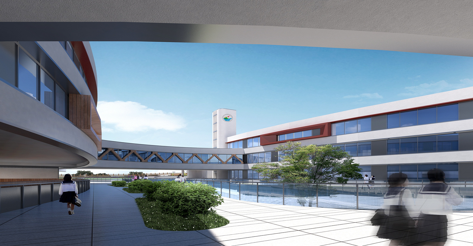校園規(guī)劃采用曲線手法,營造流水姿態(tài),將東側(cè)山脈與西側(cè)河流連接在一起。設(shè)計現(xiàn)代化“山水”校園,使學(xué)生在自然中成長。營造活水發(fā)源的“源頭”意境,寓意教育為人類文化長河的源頭,呼應(yīng)學(xué)?!霸搭^”文化。曲線舒展的形體,整體采用白色色調(diào),局部以紅黃色進行點綴,風格純潔又不失活潑。
